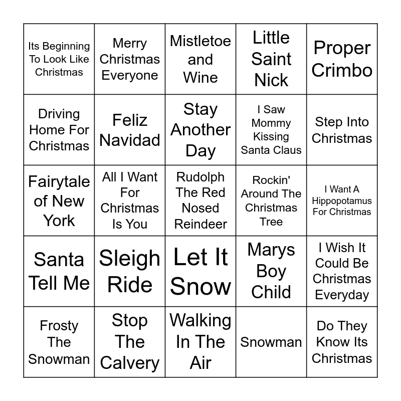 This bingo card has 35 words: Free!, Jingle Bell Rock, Santa Baby, Feliz Navidad, Let It Snow, Little Saint Nick, Driving Home For Christmas, Last Christmas, Stay Another Day, Ruldoph, Fairytale of New York, Proper Crimbo, Hey Sis Its Christmas, We Built This City, Its Beginning To Look Like Christmas, Rockin' Around The Christmas Tree, Snowman, All I Want For Christmas Is You, Santa Tell Me, Rudolph The Red Nosed Reindeer, Marys Boy Child, Frosty The Snowman, I Wish It Could Be Christmas Everyday, Stop The Calvery, Mistletoe and Wine, Step Into Christmas, Do They Know Its Christmas, Santa Claus is Coming To Town, I Saw Mommy Kissing Santa Claus, I Want A Hippopotamus For Christmas, All I Want For Christmas Is My Two Front Teeth, Walking In The Air, Sleigh Ride, Merry Christmas Everyone and White Christmas.