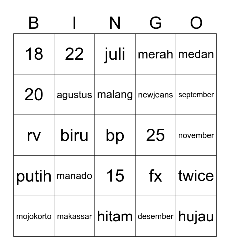 This bingo card has a free space and 24 words: manado, makassar, malang, mojokorto, medan, 18, 20, 22, 25, 15, newjeans, rv, fx, twice, agustus, desember, november, juli, september, biru, hujau, putih, merah and hitam.
