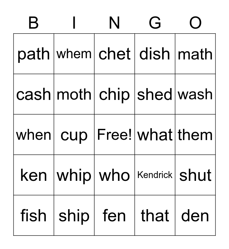 This bingo card has a free space and 24 words: whip, ship, chip, fish, math, path, cash, whem, what, who, shed, when, Kendrick, shut, moth, that, them, chet, wash, cup, den, ken, dish and fen.