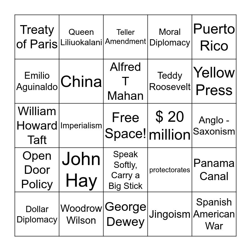 This bingo card has a free space and 24 words: John Hay, Woodrow Wilson, Alfred T Mahan, Dollar Diplomacy, Puerto Rico, Treaty of Paris, Emilio Aguinaldo, Queen Liliuokalani, $ 20 million, Speak Softly, Carry a Big Stick, Teddy Roosevelt, William Howard Taft, protectorates, Panama Canal, China, Jingoism, Anglo - Saxonism, Teller Amendment, Yellow Press, Imperialism, Spanish American War, Open Door Policy, Moral Diplomacy and George Dewey.