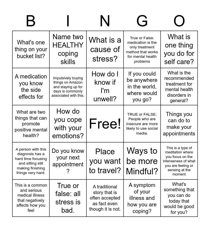 This bingo card has a free space and 24 words: This is a common and serious medical illness that negatively affects how you feel, Do you know your next appointment ?, How do I know if I'm unwell?, A symptom of your illness and how you are coping?, What is one thing you do for self care?, What's one thing on your bucket list?, Name two HEALTHY coping skills, What is a cause of stress?, TRUE or FALSE: People who are insecure are more likely to use social media., Things you can do to make your appointments, What are two things that can promote positive mental health?, Impulsively buying things on Amazon and staying up for days is commonly associated with this., Ways to be more Mindful?, This is a type of meditation where you focus on the intenseness of what you are feeling or sensing at the moment, A medication you know the side effects for, True or false: all stress is bad., A traditional story that is often accepted as fact even though it is not., True or False: medication is the only treatment method that works for mental health problems, What is the recommended treatment for mental health disorders in general?, A person with this diagnosis has a hard time focusing and sitting still making finishing things very hard., How do you cope with your emotions?, Place you want to travel?, If you could be anywhere in the world, where would you go? and What's something that you can do today that would be good for you?.