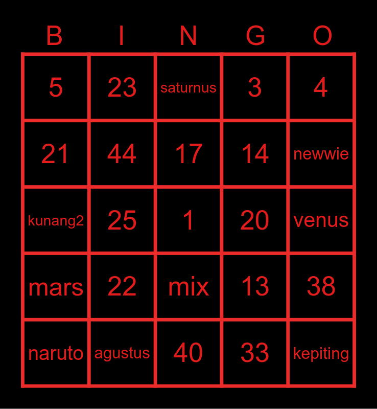This bingo card has 50 words: 31, 1, 19, 40, 22, 10, 23, 2, 21, 50, 44, 3, 38, 13, 12, 16, 17, 20, 7, 4, 25, 33, 5, 14, 8, kepiting, newwie, sakura, saturnus, mix, nanon, maret, gun, kupu2, agustus, desember, sea, kucing, kakashi, venus, jupiter, hinata, bumi, kelinci, naruto, kunang2, off, november, mars and earth.
