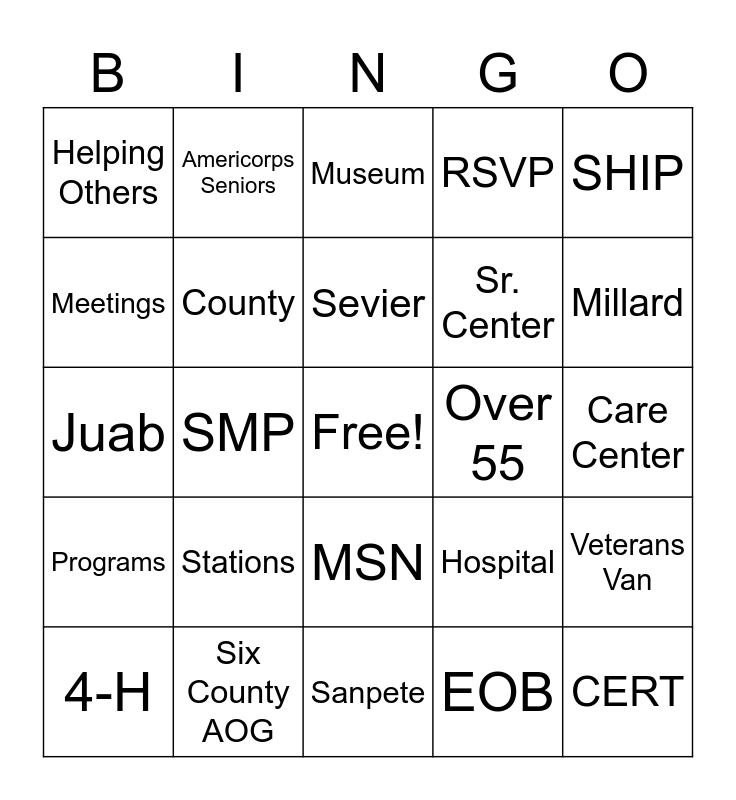 This bingo card has a free space and 34 words: schools, EOB, FGP, Tax Program, Programs, County, SHIP, 4-H, Americorps Seniors, Volunteer, Sevier, Museum, Mentioring, Food Bank, Over 55, Millard, Six County AOG, Juab, Stations, Hospital, MSN, Medicare Enrollment, Helping Others, Care Center, Sanpete, CERT, RSVP, Piute, Sr. Center, Meetings, Wayne, SMP, Veterans Van and Fraud Prevention.