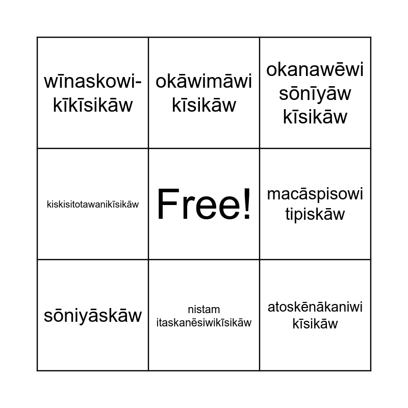 This bingo card has a free space and 16 words: ocēmi kīsikāw, mētawēwi- kīsikāw, okanawēwi sōnīyāw kīsikāw, wīnaskowi-kīkīsikāw, kīci-ayamihēwi kīsikāw, okāwimāwi kīsikāw, otawīmāwi kīsikāw, kanātani kīsikāw, atoskēnākaniwi kīsikāw, macāspisowi tipiskāw, ininiw imākanisiwi kīsikāw, kiskisitotawanikīsikāw, kiskisiwikīsikāw, nistam itaskanēsiwikīsikāw, sōniyāskāw and atatowinikīsikāw.