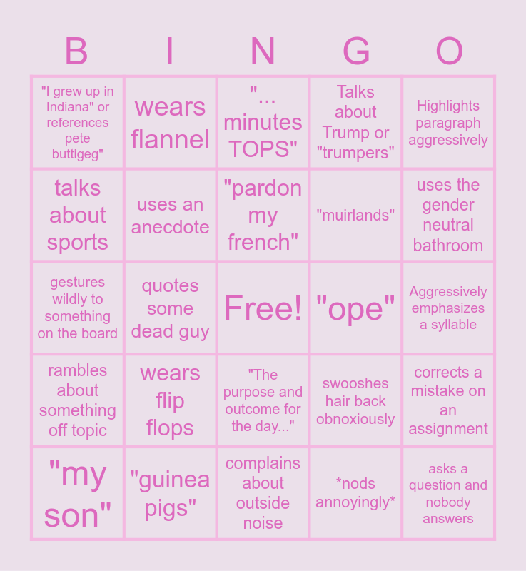 This bingo card has a free space and 24 words: wears flip flops, "guinea pigs", "pardon my french", "my son", Highlights paragraph aggressively, "I grew up in Indiana" or references pete buttigeg", talks about sports, wears flannel, "ope", "The purpose and outcome for the day...", "muirlands", gestures wildly to something on the board, swooshes hair back obnoxiously, corrects a mistake on an assignment, uses an anecdote, *nods annoyingly*, Aggressively emphasizes a syllable, "... minutes TOPS", uses the gender neutral bathroom, quotes some dead guy, asks a question and nobody answers, rambles about something off topic, Talks about Trump or "trumpers" and complains about outside noise.