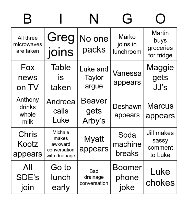 This bingo card has a free space and 24 words: Michale makes awkward conversation with drainage, Go to lunch early, Luke and Taylor argue, All SDE’s join, Martin buys groceries for fridge, All three microwaves are taken, Fox news on TV, Greg joins, Deshawn appears, Myatt appears, Vanessa appears, Anthony drinks whole milk, Soda machine breaks, Jill makes sassy comment to Luke, Table is taken, Boomer phone joke, Marcus appears, No one packs, Maggie gets JJ’s, Andreea calls Luke, Luke chokes, Chris Kootz appears, Marko joins in lunchroom and Bad drainage conversation.