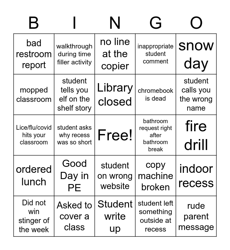 This bingo card has a free space and 24 words: Good Day in PE, Asked to cover a class, Library closed, Did not win stinger of the week, snow day, bad restroom report, mopped classroom, walkthrough during time filler activity, bathroom request right after bathroom break, student on wrong website, chromebook is dead, Lice/flu/covid hits your classroom, copy machine broken, indoor recess, student tells you elf on the shelf story, student left something outside at recess, fire drill, no line at the copier, student calls you the wrong name, student asks why recess was so short, rude parent message, ordered lunch, inappropriate student comment and Student write up.