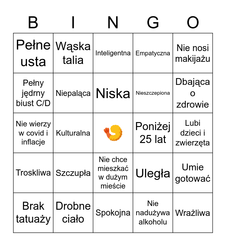 This bingo card has a free space and 24 words: Szczupła, Drobne ciało, Niska, Brak tatuaży, Nie nosi makijażu, Pełne usta, Pełny jędrny biust C/D, Wąska talia, Poniżej 25 lat, Nie chce mieszkać w dużym mieście, Nieszczepiona, Nie wierzy w covid i inflacje, Uległa, Umie gotować, Niepaląca, Nie nadużywa alkoholu, Lubi dzieci i zwierzęta, Inteligentna, Dbająca o zdrowie, Kulturalna, Wrażliwa, Troskliwa, Empatyczna and Spokojna.