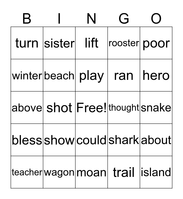 This bingo card has a free space and 24 words: show, wagon, play, teacher, poor, turn, winter, sister, thought, could, ran, above, shark, about, beach, trail, snake, lift, hero, shot, island, bless, rooster and moan.