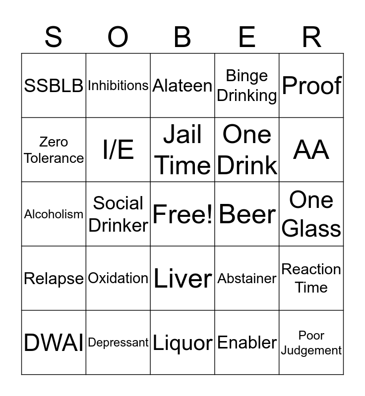 This bingo card has a free space and 24 words: Oxidation, Depressant, Jail Time, DWAI, Proof, SSBLB, Zero Tolerance, Inhibitions, Beer, Liver, One Drink, Alcoholism, Abstainer, Reaction Time, I/E, Enabler, One Glass, Alateen, AA, Social Drinker, Poor Judgement, Relapse, Binge Drinking and Liquor.