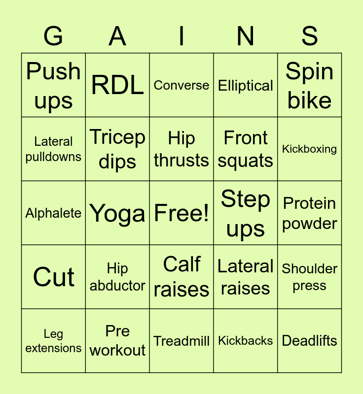 This bingo card has a free space and 49 words: Back squats, Deadlifts, Bench press, Treadmill, Hip abductor, Chin ups, RDL, Underhand rows, Lateral pulldowns, Bicep curls, Tricep dips, Elliptical, Shoulder press, Lateral raises, Hammer curls, Bulgarians, Hip thrusts, Step ups, Reverse lunges, Spin bike, Yoga, Kickbacks, Push ups, Front squats, Around the worlds, Kickboxing, Leg extensions, Hamstring curls, Calf raises, Cut, Bulk, Powerlifting, Bodybuilding, Macros, Pre workout, Creatine, BCAA, EAA, Protein powder, Shaker cups, Gymshark, AYBL, Lululemon, Fabletics, Alphalete, Converse, Greens, GIRL GAINS and "Gym rats".