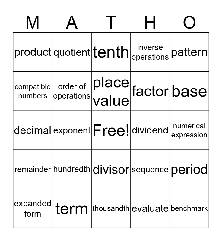 This bingo card has a free space and 24 words: hundredth, term, place value, expanded form, pattern, product, compatible numbers, quotient, dividend, divisor, factor, decimal, sequence, period, order of operations, evaluate, numerical expression, tenth, base, exponent, benchmark, remainder, inverse operations and thousandth.