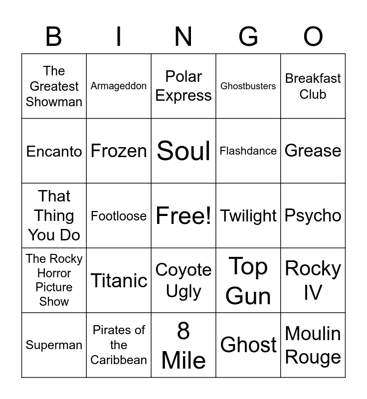 This bingo card has a free space and 50 words: Dirty Dancing, Moulin Rouge, Purple Rain, 8 Mile, Titanic, The Bodyguard, Armageddon, Trolls, Encanto, Where the Crawdad Sings, Frozen, Ghostbusters, Rocky IV, Top Gun, 9 to 5, A Star Is Born, Soul, Twilight, Pitch Perfect, Breakfast Club, Footloose, Ghost, The Greatest Showman, Flashdance, Robin Hood, Men In Black, Grease, O Brother Where Are Thou, Polar Express, Coyote Ugly, Shrek, Harry Potter and the Sorcerer's Stone, Risky Business, National Lampoon's Vacation, Pirates of the Caribbean, Wizard of Oz, Austin Powers, Jaws, Jurassic Park, Psycho, Mission Impossible, Schindler's List, Raiders of the Lost Ark, Star Wars, Superman, That Thing You Do, The Pink Panther, Toy Story, The Rocky Horror Picture Show and The Avengers.