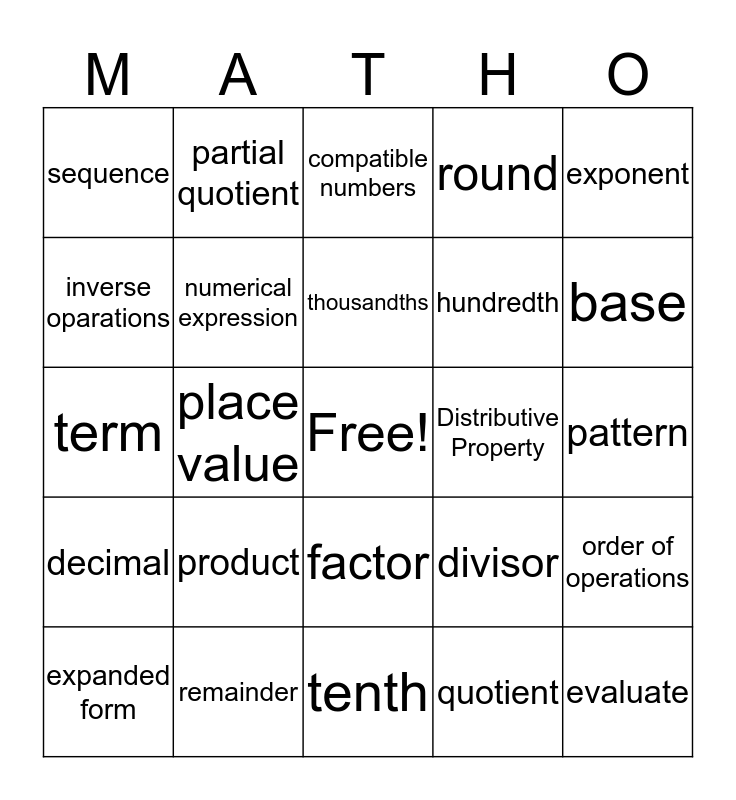 This bingo card has a free space and 24 words: product, remainder, thousandths, expanded form, exponent, sequence, inverse oparations, partial quotient, Distributive Property, factor, hundredth, term, divisor, order of operations, numerical expression, quotient, pattern, compatible numbers, base, place value, evaluate, decimal, round and tenth.