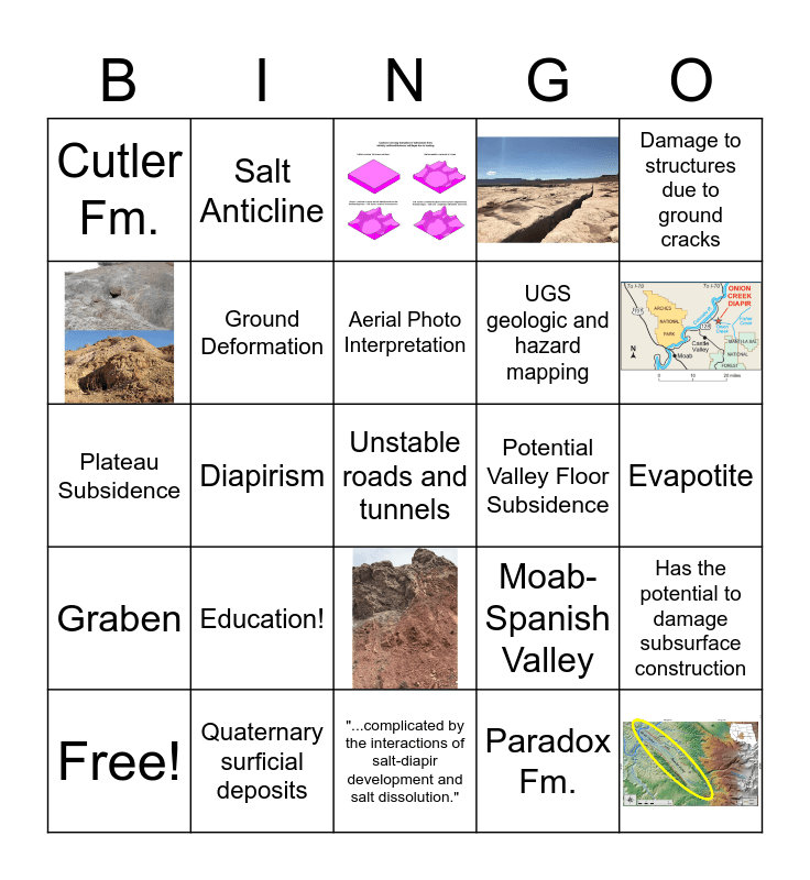 This bingo card has 7 images, a free space and 18 words: Free!, Education!, Aerial Photo Interpretation, Paradox Fm., Cutler Fm., Salt Anticline, UGS geologic and hazard mapping, Has the potential to damage subsurface construction, Plateau Subsidence, Ground Deformation, Moab-Spanish Valley, Quaternary surficial deposits, "...complicated by the interactions of salt-diapir development and salt dissolution.", Evapotite, Graben, Diapirism, Potential Valley Floor Subsidence and Damage to structures due to ground cracks.