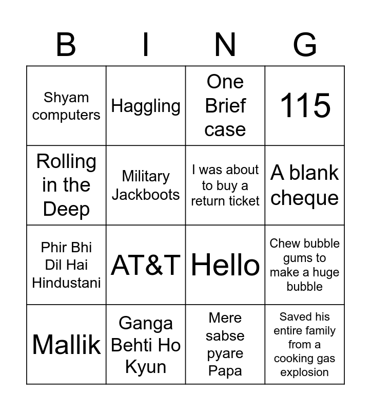 This bingo card has 17 words: Mere sabse pyare Papa, Mallik, One Brief case, Shyam computers, AT&T, 115, Chew bubble gums to make a huge bubble, I was about to buy a return ticket, A blank cheque, Military Jackboots, Ganga Behti Ho Kyun, Hello, Rolling in the Deep, Haggling, Phir Bhi Dil Hai Hindustani, Bobby and Saved his entire family from a cooking gas explosion.
