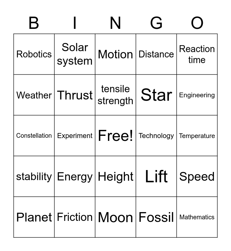 This bingo card has a free space and 36 words: Aerodynamics, Gravity, Drag, Thrust, Lift, stability, tensile strength, dead load, Reaction time, environmental load, Experiment, Distance, Science, Technology, Engineering, Robotics, Gaelhawks, Energy, Mathematics, Motion, Temperature, Speed, Friction, Planet, Moon, Solar system, Constellation, Sun, Star, Weather, Erosion, Scientist, Fossil, Height, measurement and Weight.