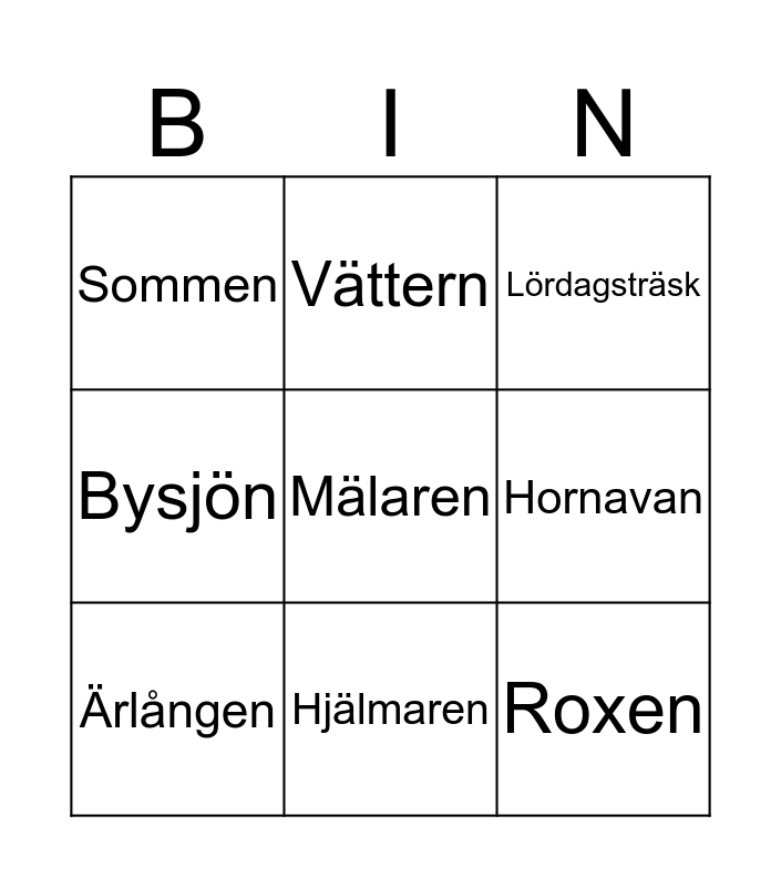 This bingo card has a free space and 8 words: Hornavan, Lördagsträsk, Vättern, Ärlången, Sommen, Roxen, Bysjön and Hjälmaren.