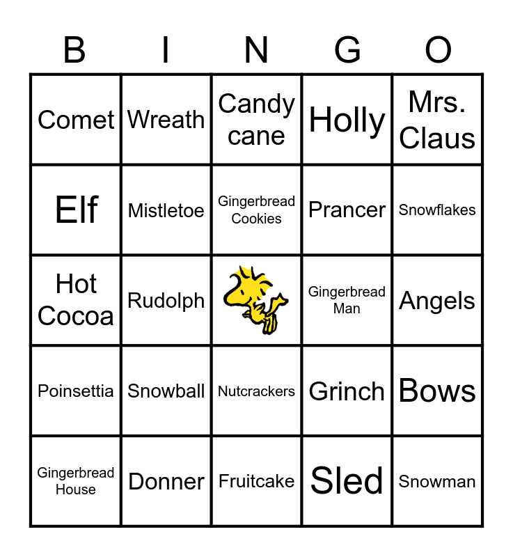 This bingo card has a free space and 53 words: Reindeer, Snowman, Sleigh, Sled, Snowball, Mittens, Wreath, Pinecone, Elf, Jingle bells, Mistletoe, Ribbons, Bows, Grinch, Christmas Tree, Gingerbread House, Gingerbread Cookies, Gingerbread Man, Santa, Mrs. Claus, Rudolph, Dasher, Prancer, Comet, Vixen, Donner, Blitzen, Dancer, Caroling, Snowflakes, Flurries, Gifts, Coal, Nice List, Naughty List, Stockings, Holly, Fruitcake, Candy cane, Toys, Tinsel, Star, Angels, Lights, Baubles, Nutcrackers, Fireplace, Peppermint, Hot Cocoa, Poinsettia, Snow globe, Presents and Yule Log.