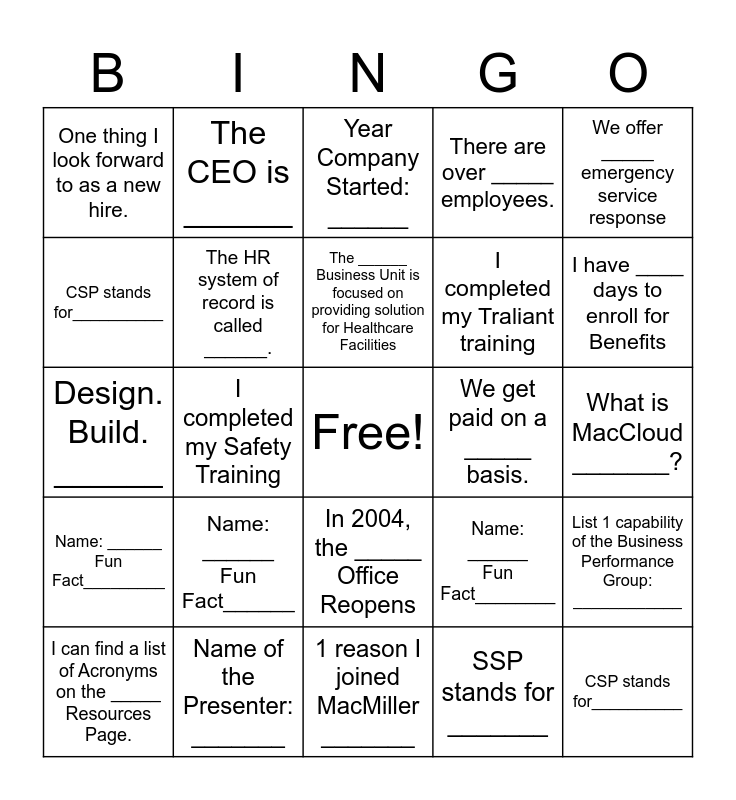 This bingo card has a free space and 24 words: I can find a list of Acronyms on the _____ Resources Page., Name: ______ Fun Fact______, The ______ Business Unit is focused on providing solution for Healthcare Facilities, SSP stands for _______, We offer _____ emergency service response, One thing I look forward to as a new hire., The CEO is ______, Year Company Started: ______, We get paid on a _____ basis., What is MacCloud _______?, Design. Build. ______, The HR system of record is called ______., Name: ______ Fun Fact________, List 1 capability of the Business Performance Group: ____________, CSP stands for__________, Name of the Presenter: _______, 1 reason I joined MacMiller _______, There are over _____ employees., I have ____ days to enroll for Benefits, Name: ______ Fun Fact_________, I completed my Safety Training, In 2004, the _____ Office Reopens, I completed my Traliant training and CSP stands for__________.
