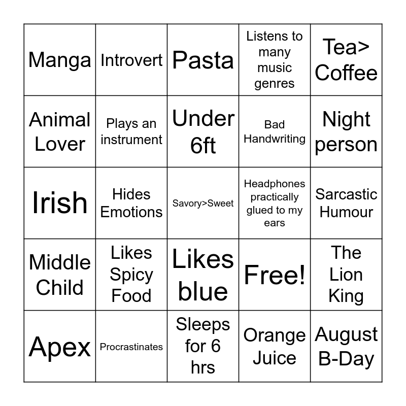 This bingo card has 25 words: Likes Spicy Food, Sleeps for 6 hrs, Under 6ft, Apex, Tea> Coffee, Manga, Animal Lover, Introvert, Headphones practically glued to my ears, Likes blue, Bad Handwriting, Irish, Free!, The Lion King, Plays an instrument, August B-Day, Sarcastic Humour, Pasta, Night person, Hides Emotions, Savory>Sweet, Procrastinates, Middle Child, Listens to many music genres and Orange Juice.