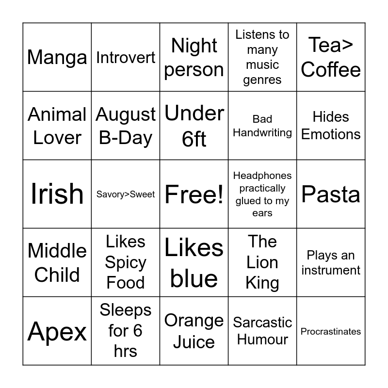This bingo card has a free space and 24 words: Likes Spicy Food, Sleeps for 6 hrs, Under 6ft, Apex, Tea> Coffee, Manga, Animal Lover, Introvert, Headphones practically glued to my ears, Likes blue, Bad Handwriting, Irish, The Lion King, Plays an instrument, August B-Day, Sarcastic Humour, Pasta, Night person, Hides Emotions, Savory>Sweet, Procrastinates, Middle Child, Listens to many music genres and Orange Juice.
