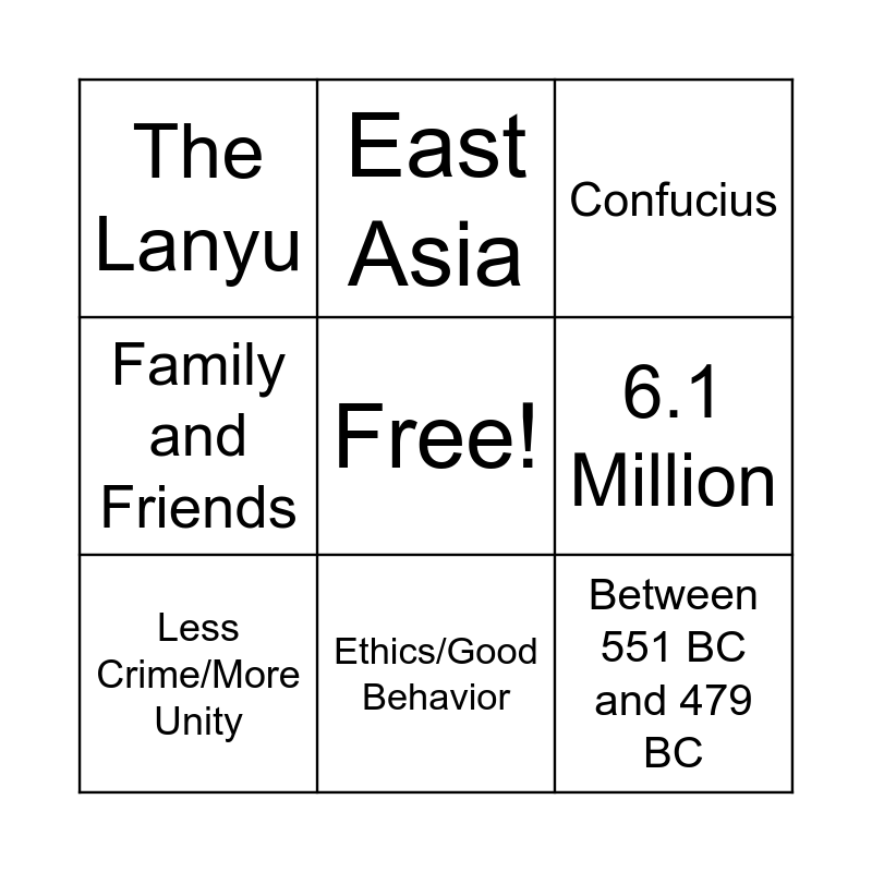 This bingo card has a free space and 8 words: 6.1 Million, Confucius, East Asia, Less Crime/More Unity, The Lanyu, Between 551 BC and 479 BC, Family and Friends and Ethics/Good Behavior.