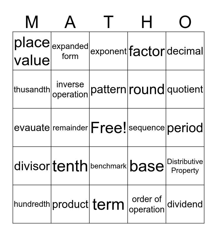 This bingo card has a free space and 24 words: tenth, product, pattern, hundredth, decimal, place value, thusandth, expanded form, sequence, benchmark, round, evauate, base, Distributive Property, inverse operation, order of operation, period, exponent, quotient, remainder, dividend, divisor, factor and term.
