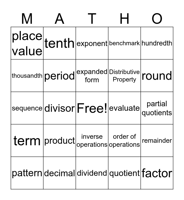 This bingo card has a free space and 24 words: product, decimal, expanded form, pattern, hundredth, place value, thousandth, tenth, evaluate, inverse operations, Distributive Property, sequence, order of operations, remainder, period, quotient, partial quotients, exponent, round, divisor, factor, term, benchmark and dividend.