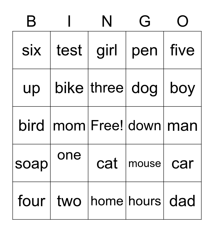 This bingo card has a free space and 24 words: one, two, three, four, five, six, up, test, down, cat, dog, bird, mouse, car, bike, hours, man, girl, boy, mom, dad, soap, pen and home.