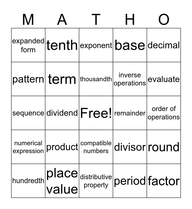 This bingo card has a free space and 24 words: product, place value, thousandth, hundredth, decimal, expanded form, pattern, tenth, remainder, compatible numbers, inverse operations, sequence, divisor, round, term, period, order of operations, exponent, evaluate, dividend, factor, numerical expression, base and distributive property.