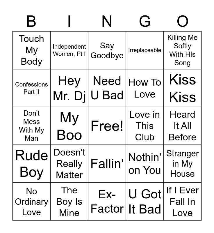 This bingo card has a free space and 88 words: R&BPretty Wings, I'd Rather Go Blind, Fallin', Let Me Love You, We Belong Together, How You Gonna Act Like That, Foolish, Rock The Boat, If I Ain't Got You, Cry Me a River, Umbrella, Golden, Stranger in My House, Heard It All Before, Buy U a Drank, Need U Bad, Bust Your Windows, Ignition, Say My Name, Try Again, When I See U, Let It Go, Don't Mess With My Man, Crazy In Love, U Got It Bad, I Remember, Nobody, Love Of My Life, teachme, Not Gon' Cry, Say Goodbye, Irreplaceable, Can't Let Go, Dilemma, Doesn't Really Matter, Confessions Part II, Touch My Body, Single Ladies, Bleeding Love, Kiss Kiss, My Boo, Knock You Down, Miss Independent, Nothin' on You, Love in This Club, Dear Mama, No Air, No One, Hate That I Love YOu, How To Love, U Remind Me, Only Girl, With You, What's My Name?, Grenade, Diamonds, Rude Boy, Independent Women, Pt I, Always On Time, Sexy Love, Waterfalls, More Than A Woman, Survivor, Candy Rain, Just Kickin’ It, The Boy Is Mine, Feels Good, Hey Mr. Dj, No Ordinary Love, If I Ever Fall In Love, Waterfalls, I Will Always Love YOu, Twisted, Killing Me Softly With HIs Song, On & ON, I get Lonely, Sittin’ Up In My Room, Nice & Slow, Ex-Factor, Knockin’ Da Boots, My Lovin’, Remember the Time, Always Be My Baby, No Diggity, This is How We Do It, Poison, Creep and Right Here.