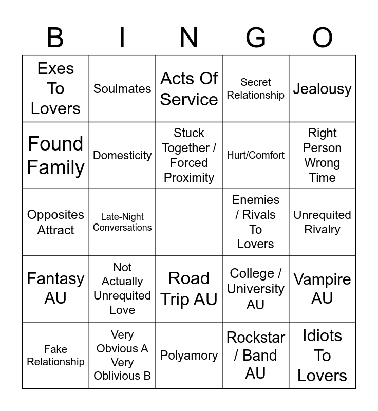 This bingo card has a free space and 82 words: 3+1 / 5+1 Things, Accidental Relationship, Acts Of Service, Actually Fake Dating, Angst With A Happy Ending, Bad Flirting, Banter / Bickering, Based On Other Media, Character Study, Childhood Friends, Childhood Friends To Lovers, Confessions, Domesticity, Enemies / Rivals To Lovers, Established Relationship, Exes To Lovers, Fake Relationship, Found Family, Friends To Lovers, Happy Ending, Humor, Hurt/Comfort, Idiots To Lovers, Jealousy, Late-Night Conversations, Love Languages, Meddling / Matchmaking, Mutual Pining, No One Believes They're Dating, Non-Linear Narrative, Not Actually Unrequited Love, Only One Bed, Opposites Attract, Partners In Crime, Pining, Polyamory, Practice Kissing, Professional Partners To Lovers, Right Person Wrong Time, Romcom, Roommates, Secret Relationship, Sharing Dreams, Slice Of Life, Slow Burn, Soulmates, Strangers To Lovers, Stuck Together / Forced Proximity, Time Loop, Trope Subversion, Unrequited Love, Unrequited Rivalry, Very Obvious A Very Oblivious B, We Kissed Once But We Don't Talk About It, Angels and Demons AU, Bakery AU, Boarding School AU, Buzzfeed Unsolved AU, Coffee Shop AU, College / University AU, Dark Academia AU, Demigods AU, Fantasy AU, Florist x Tattoo Artist AU, Folklore / Mythology AU, Historical AU, Hospital AU, Lawyers AU, Magical AU, Modern With Magic AU, Non-Idol Celebrity AU, Pacific Rim AU, Road Trip AU, Rockstar / Band AU, Royalty AU, Sports AU, Spy AU, Sugar Baby AU, Superpowers / Superhero AU, Urban Fantasy AU, Vampire AU and Wedding Planner AU.