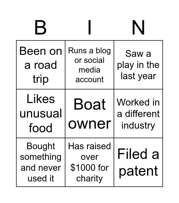 This bingo card has 42 words: Won a contest, Has raised over $1000 for charity, Middle child, Birthday on a holiday, Ran a marathon, In a band, Dog owner, Club leader, Saw a play in the last year, Still talks to childhood best friend, Traveled to Africa, Foster parent, Works out 3+ times per week, Boat owner, Loves roller coasters, Classic car lover or owner, Works two jobs, Pet a real-life elephant, Cat owner, Runs a blog or social media account, Worked in a different industry, Never learned to drive, Attended college as an older adult, Been on a road trip, Participated in Karaokee, Planted a tree, Filed a patent, Had a blind date, Flew in a helicopter, Drank too much on Oktoberfest, Visited minimum 3 of 5: London, Paris, NY, Singapore, Tokyo, Never had a Facebook account, Bought something and never used it, Read a book about quantum physics, Had a meal in a fast food restaurant last week, Does not like beer, Loves handcrafting, Still lives in his birth area, Does have kid(s), Never spent a night in the hospital, Likes unusual food and Speaks more than 3 languages fluently.