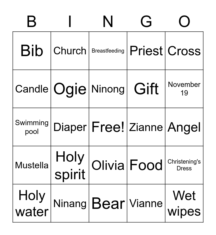 This bingo card has a free space and 24 words: Holy spirit, Ninang, Ninong, Holy water, Cross, Bib, Candle, Church, Zianne, Olivia, Gift, Swimming pool, Food, Christening's Dress, Ogie, Vianne, Angel, Breastfeeding, November 19, Diaper, Wet wipes, Mustella, Priest and Bear.