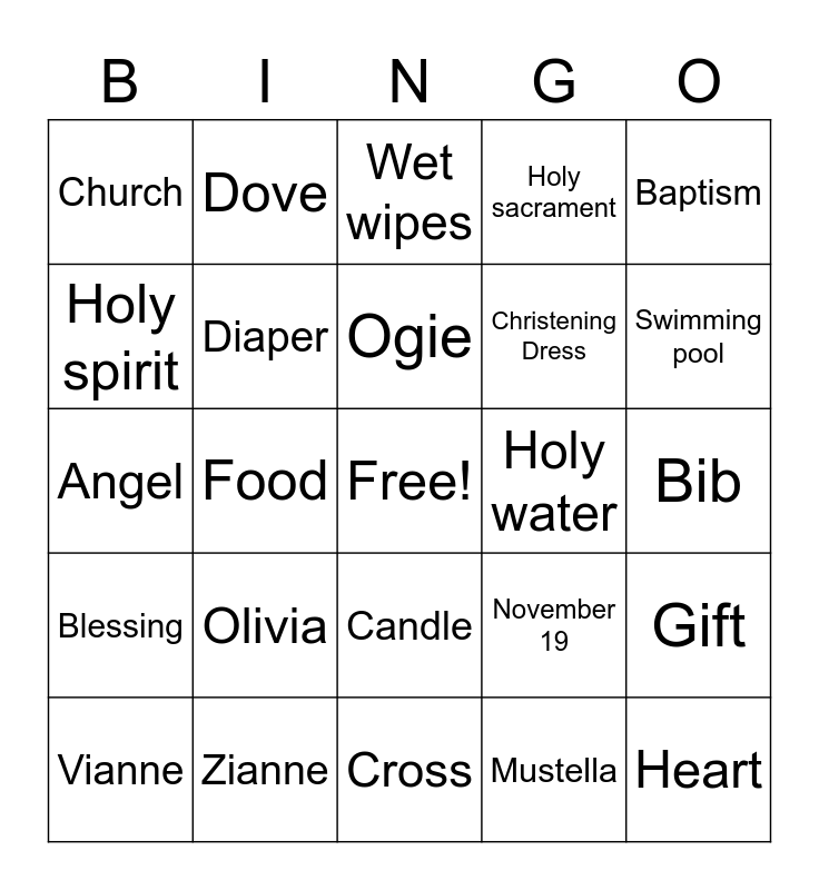 This bingo card has a free space and 24 words: Olivia, Zianne, Ogie, Vianne, Baptism, Church, Holy spirit, Dove, Holy water, Candle, Christening Dress, Angel, November 19, Gift, Diaper, Mustella, Bib, Wet wipes, Swimming pool, Food, Heart, Blessing, Holy sacrament and Cross.