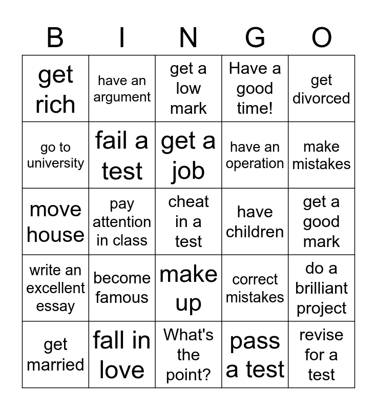 This bingo card has a free space and 24 words: become famous, fall in love, get a job, get married, get divorced, get rich, go to university, have an argument, have children, make up, have an operation, move house, correct mistakes, do a brilliant project, fail a test, pass a test, get a good mark, get a low mark, make mistakes, pay attention in class, revise for a test, write an excellent essay, Have a good time! and What's the point?.