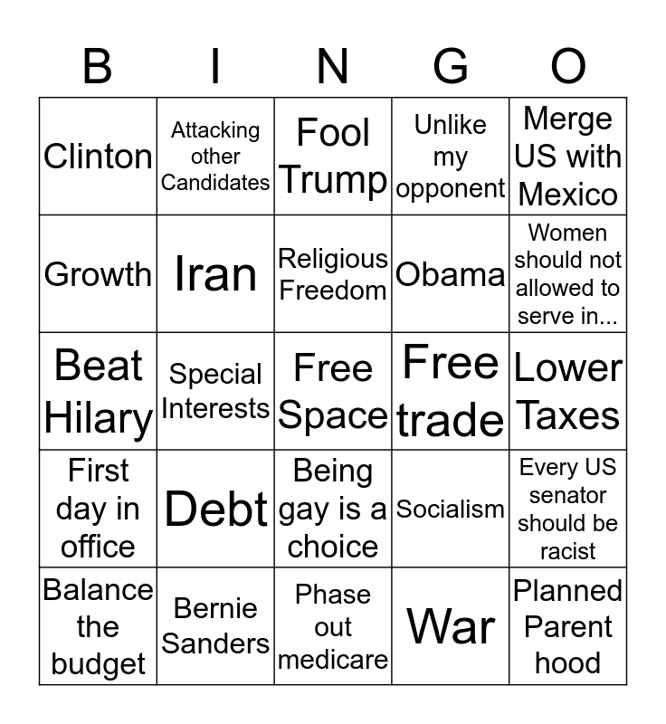 This bingo card has a free space and 24 words: Debt, Bernie Sanders, Religious Freedom, Balance the budget, Merge US with Mexico, Clinton, Growth, Attacking other Candidates, Free trade, Being gay is a choice, Obama, Beat Hilary, Socialism, Every US senator should be racist, Iran, War, Lower Taxes, Fool Trump, Women should not allowed to serve in..., Special Interests, Planned Parent hood, First day in office, Unlike my opponent and Phase out medicare.