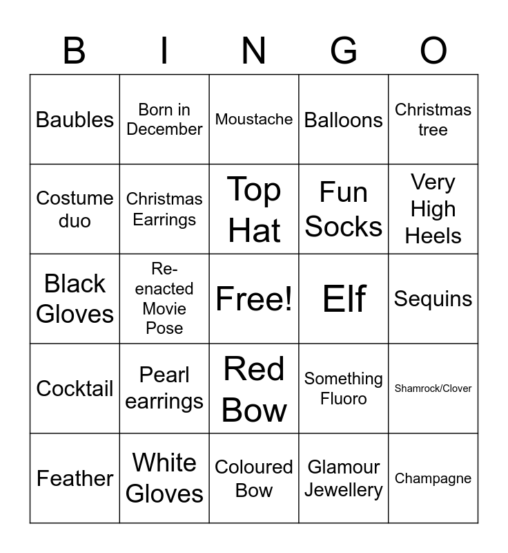 This bingo card has a free space and 24 words: Pearl earrings, White Gloves, Top Hat, Feather, Christmas tree, Baubles, Costume duo, Born in December, Elf, Red Bow, Fun Socks, Black Gloves, Something Fluoro, Shamrock/Clover, Christmas Earrings, Glamour Jewellery, Sequins, Moustache, Very High Heels, Re-enacted Movie Pose, Champagne, Cocktail, Balloons and Coloured Bow.