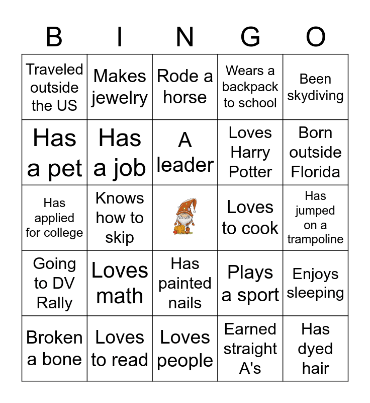 This bingo card has a free space and 24 words: Loves math, Loves to read, A leader, Broken a bone, Been skydiving, Traveled outside the US, Has a pet, Makes jewelry, Loves to cook, Has painted nails, Loves Harry Potter, Has applied for college, Plays a sport, Enjoys sleeping, Has a job, Earned straight A's, Has jumped on a trampoline, Rode a horse, Born outside Florida, Knows how to skip, Has dyed hair, Going to DV Rally, Wears a backpack to school and Loves people.
