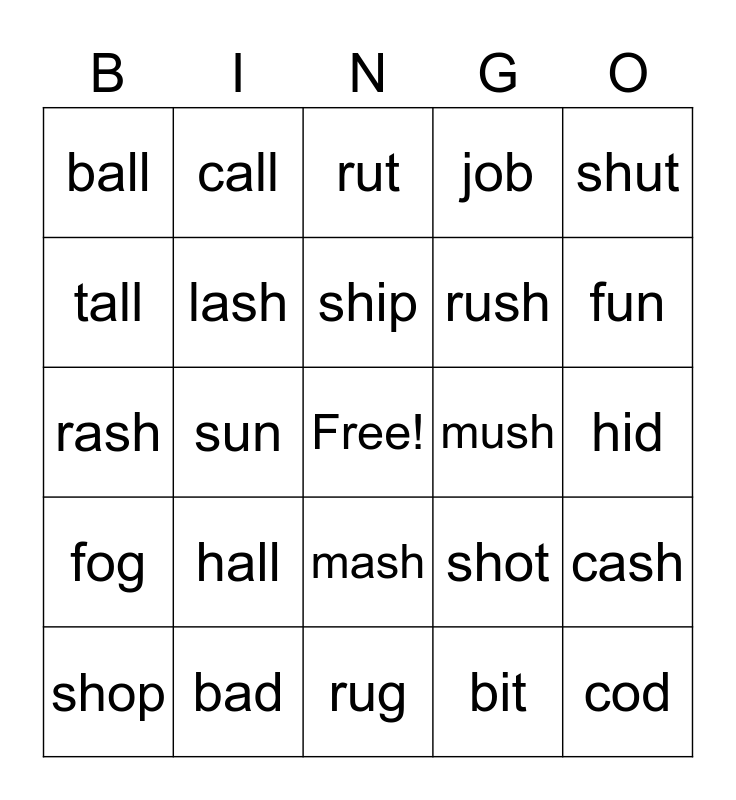 This bingo card has a free space and 24 words: hall, bad, ship, shop, shut, ball, tall, call, mush, mash, rush, rash, shot, cash, lash, bit, hid, rut, fun, sun, cod, fog, job and rug.
