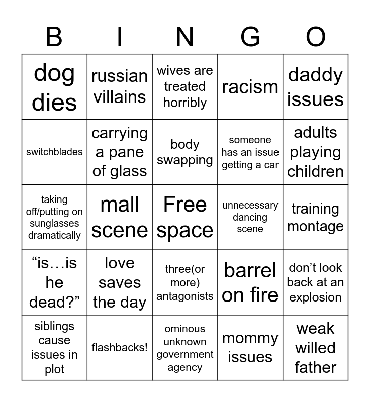 This bingo card has a free space and 34 words: On the nose music, mommy issues, “NOOOOOOOOO!”, graphic sexual scenes/innuendos, “is…is he dead?”, carrying a pane of glass, daddy issues, siblings cause issues in plot, russian villains, refusing to actually kill someone, body swapping, wives are treated horribly, expositional speech, cocaine, unnecessary dancing scene, adults playing children, flashbacks!, taking off/putting on sunglasses dramatically, love saves the day, barrel on fire, three(or more) antagonists, slow motion, dog dies, training montage, ominous unknown government agency, weak willed father, racism, mysterious devilish creachure, someone has an issue getting a car, switchblades, gang of young punks, mall scene, don’t look back at an explosion and fbi flashing badge.