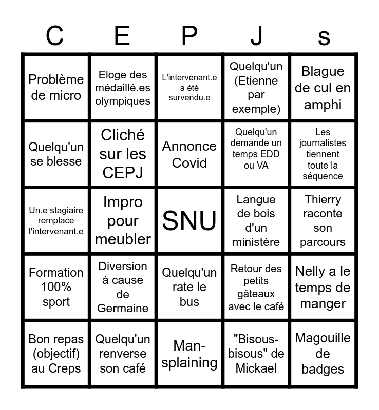 This bingo card has a free space and 24 words: Diversion à cause de Germaine, Quelqu'un renverse son café, Annonce Covid, Bon repas (objectif) au Creps, Blague de cul en amphi, Problème de micro, Quelqu'un se blesse, Eloge des médaillé.es olympiques, Langue de bois d'un ministère, Quelqu'un rate le bus, Quelqu'un demande un temps EDD ou VA, Un.e stagiaire remplace l'intervenant.e, Retour des petits gâteaux avec le café, Nelly a le temps de manger, Cliché sur les CEPJ, "Bisous-bisous" de Mickael, Thierry raconte son parcours, L'intervenant.e a été survendu.e, Les journalistes tiennent toute la séquence, Impro pour meubler, Magouille de badges, Formation 100% sport, Quelqu'un (Etienne par exemple) and Man-splaining.