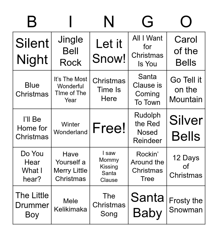 This bingo card has a free space and 31 words: The Christmas Song, Sleigh Ride, Winter Wonderland, Jingle Bells, Silent Night, Let it Snow!, It’s The Most Wonderful TIme of The Year, Rockin’ Around the Christmas Tree, Rudolph the Red Nosed Reindeer, Santa Baby, Silver Bells, Frosty the Snowman, Oh Come All Ye Faithful, Feliz Navidad, Go Tell it on the Mountain, White Christmas, 12 Days of Christmas, Have Yourself a Merry Little Christmas, Do You Hear What I hear?, I saw Mommy Kissing Santa Clause, Carol of the Bells, Holly Jolly Christmas, The Little Drummer Boy, Jingle Bell Rock, Santa Clause is Coming To Town, Blue Christmas, All I Want for Christmas Is You, I’ll Be Home for Christmas, Mele Kelikimaka, Christmas Time Is Here and Hark! The Herald Angels Sing.