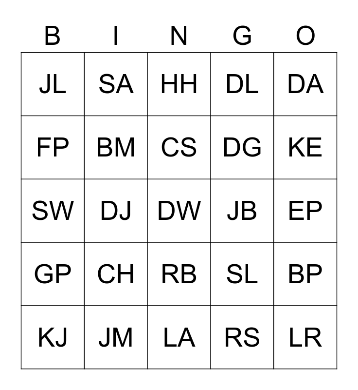 This bingo card has 38 words: JJ, BD, BH, BM, BP, CH, CS, CW, DA, DG, DJ, DL, DW, EP, FP, GP, HC, HH, HR, JB, JL, JM, KE, KJ, KR, LA, LR, LS, ML, MS, RA, RB, RS, SA, SK, SL, SW and TN.