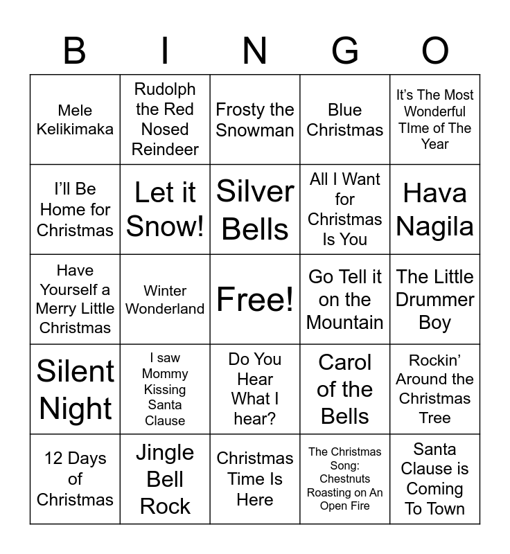 This bingo card has a free space and 32 words: The Christmas Song: Chestnuts Roasting on An Open Fire, Sleigh Ride, Winter Wonderland, Jingle Bells, Silent Night, Let it Snow!, It’s The Most Wonderful TIme of The Year, Rockin’ Around the Christmas Tree, Rudolph the Red Nosed Reindeer, Santa Baby, Silver Bells, Frosty the Snowman, Oh Come All Ye Faithful, Feliz Navidad, Go Tell it on the Mountain, White Christmas, 12 Days of Christmas, Have Yourself a Merry Little Christmas, Do You Hear What I hear?, I saw Mommy Kissing Santa Clause, Carol of the Bells, Holly Jolly Christmas, The Little Drummer Boy, Jingle Bell Rock, Santa Clause is Coming To Town, Blue Christmas, All I Want for Christmas Is You, I’ll Be Home for Christmas, Mele Kelikimaka, Christmas Time Is Here, Hark! The Herald Angels Sing and Hava Nagila.