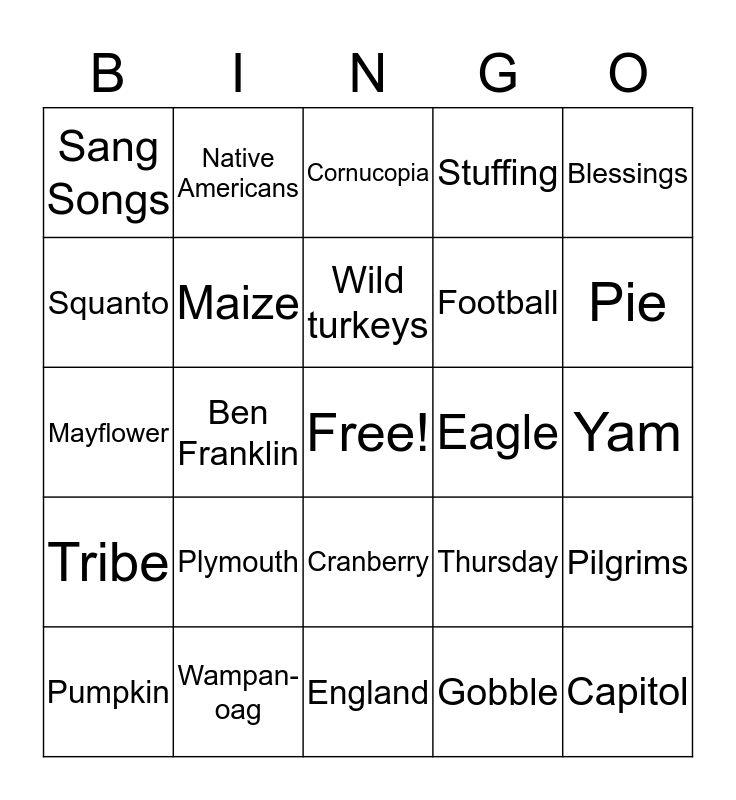 This bingo card has a free space and 24 words: Plymouth, Wampan- oag, Wild turkeys, Pumpkin, Blessings, Sang Songs, Squanto, Native Americans, Eagle, Cranberry, Football, Mayflower, Thursday, Pilgrims, Maize, Gobble, Yam, Cornucopia, Pie, Ben Franklin, Capitol, Tribe, Stuffing and England.