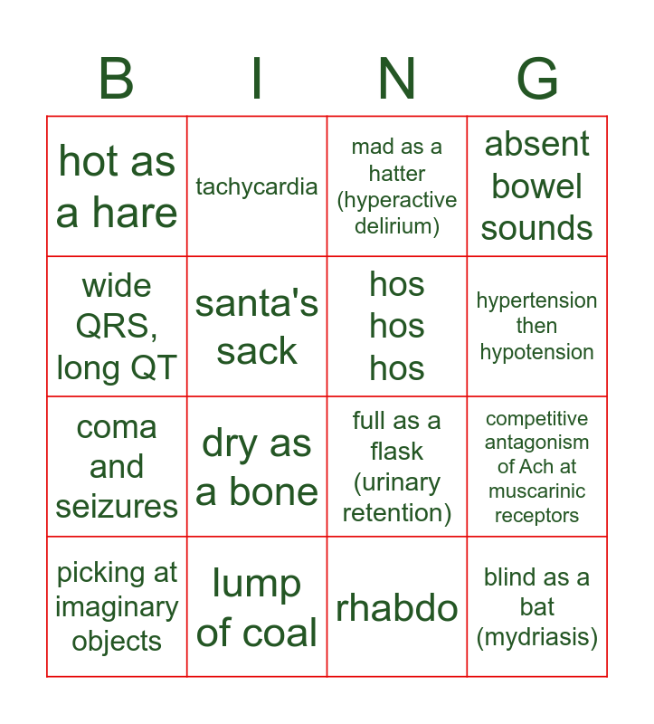 This bingo card has 18 words: dry as a bone, blind as a bat (mydriasis), mad as a hatter (hyperactive delirium), hot as a hare, full as a flask (urinary retention), absent bowel sounds, picking at imaginary objects, tachycardia, hypertension then hypotension, coma and seizures, rhabdo, wide QRS, long QT, competitive antagonism of Ach at muscarinic receptors, santa's sack, hos hos hos, ugly Christmas sweater, lump of coal and abominable snowman.