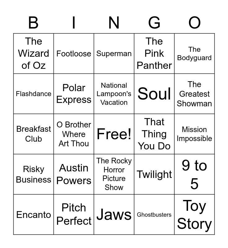 This bingo card has a free space and 50 words: Schindler's List, Toy Story, Raiders of the Lost Ark, Jaws, Austin Powers, Grease, Footloose, 8 Mile, Flashdance, Ghost, Polar Express, The Pink Panther, 9 to 5, Twilight, Dirty Dancing, Robin Hood, National Lampoon's Vacation, That Thing You Do, A Star Is Born, The Bodyguard, O Brother Where Art Thou, Ghostbusters, The Wizard of Oz, Soul, Star Wars, Armageddon, The Greatest Showman, Coyote Ugly, Superman, The Rocky Horror Picture Show, Trolls, Purple Rain, Men In Black, The Avengers, Pitch Perfect, Moulin Rouge, Where the Crawdad Sings, Rocky IV, Harry Potter and the Sorcerer's Stone, Mission Impossible, Jurassic Park, Pirates of the Caribbean, Top Gun, Frozen, Encanto, Breakfast Club, Shrek, Titanic, Risky Business and Psycho.