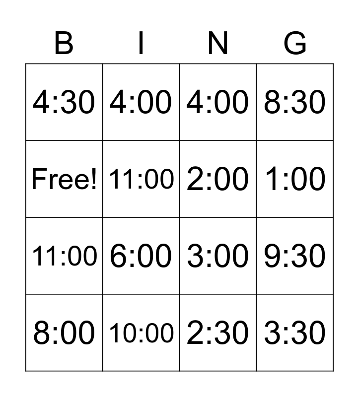 This bingo card has 16 words: 10:00, 9:30, 4:00, 4:30, 11:00, 4:00, 3:00, 2:30, Free!, 11:00, 8:00, 8:30, 6:00, 1:00, 2:00 and 3:30.